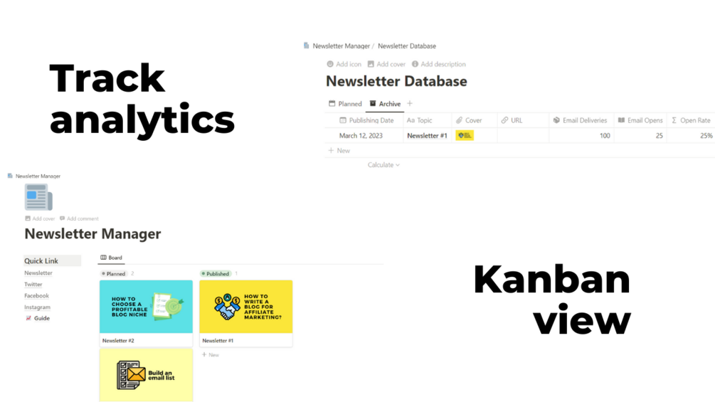 This newsletter manager includes a board view, your newsletter article list, and an archive that stores all your previous newsletter articles.